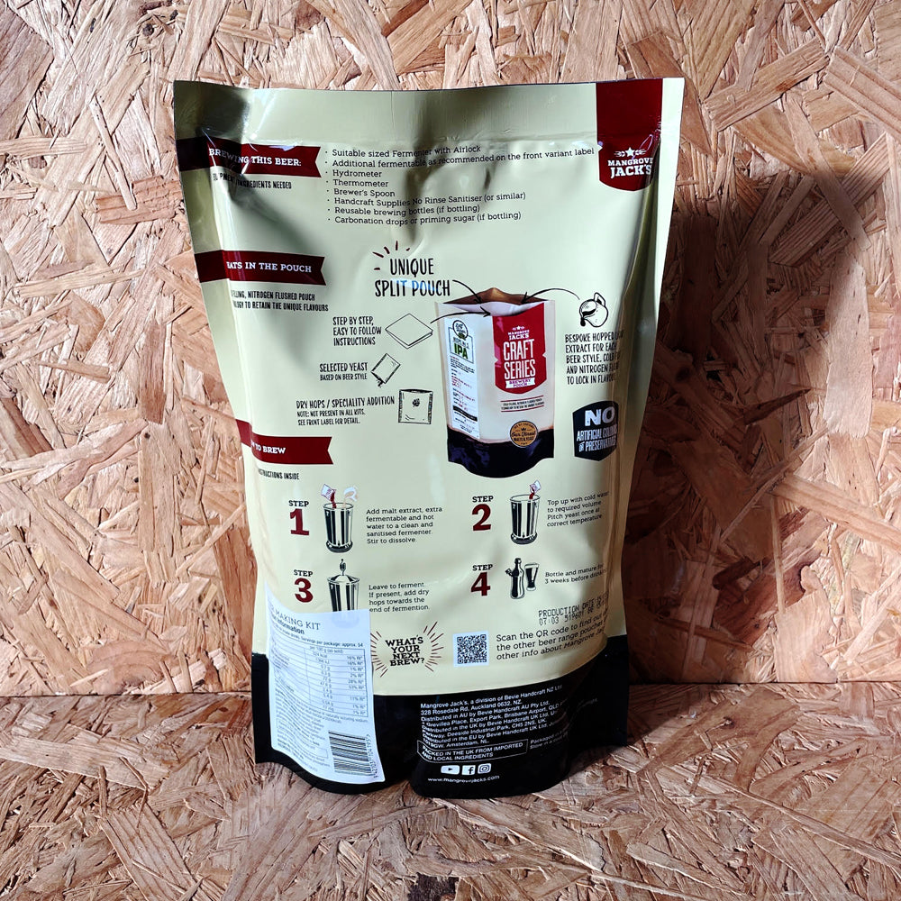 Mangrove Jacks Hazy IPA Beer Kit (India Pale Ale) has fresh and punchy, tropical, citrus and stone fruit aromas as expected with American style craft beers. A moderate bitterness balances it all, as it pours a hazy golden colour with a white fluffy head. Hopped with Citra, Mosaic and Simcoe, this kit brews up to 18 litres and will have a finished alcohol content of around 6.8%