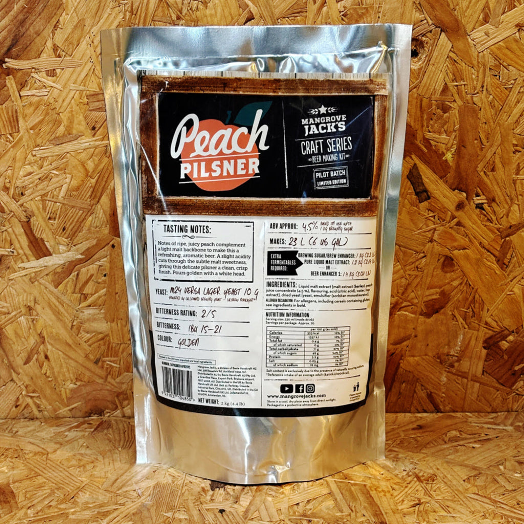The Mangrove Jacks Peach Pilsner has a juicy peach flavour which complements the light malt, to make this a refreshing, aromatic beer. A slight acidity cuts through the subtle malt sweetness, giving this delicate pilsner a clean, crisp finish.